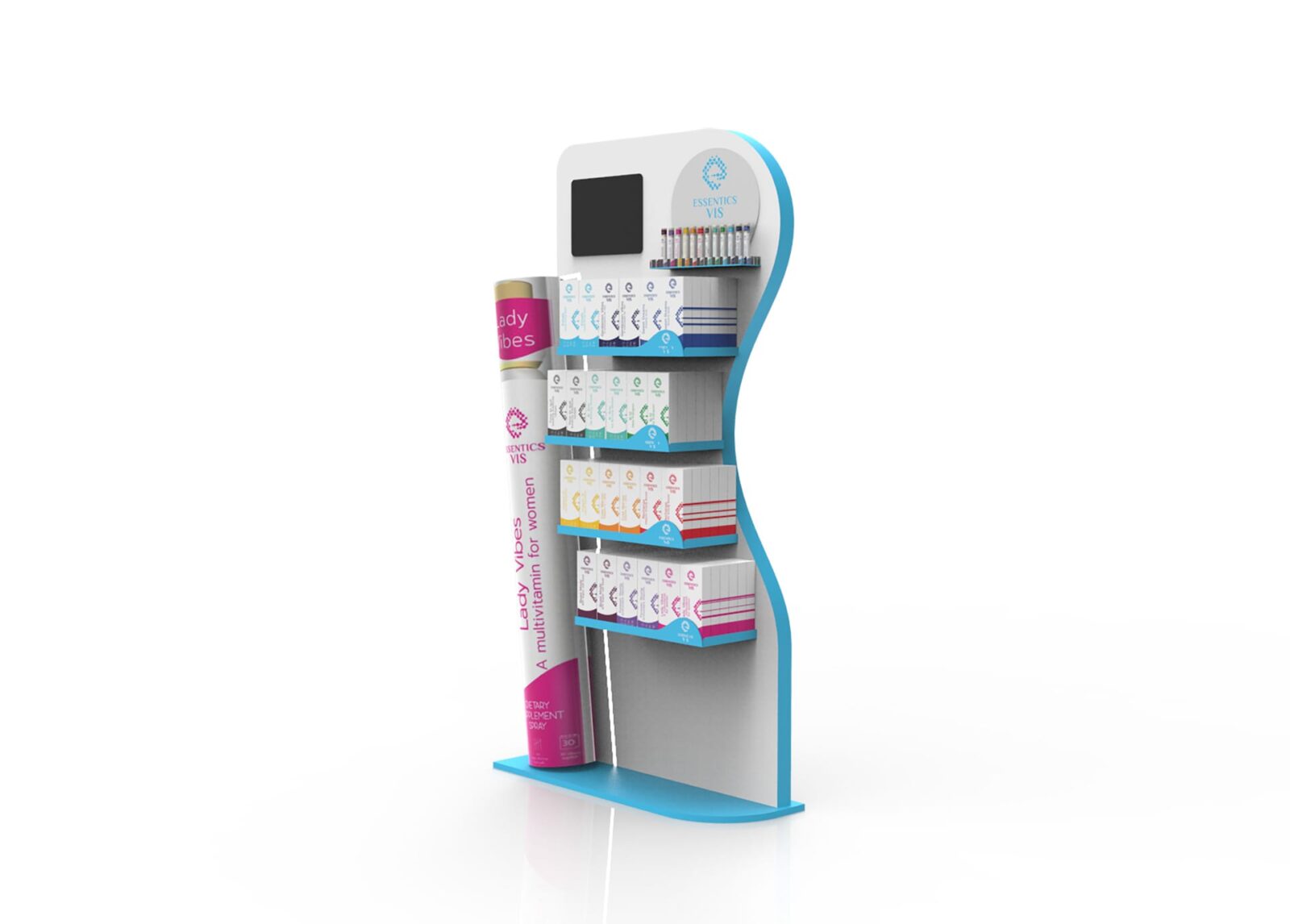 עיצוב קונספט ותכנון סטנדים לחברת אסנטיקס המשווקת ספריי ויטמינים.