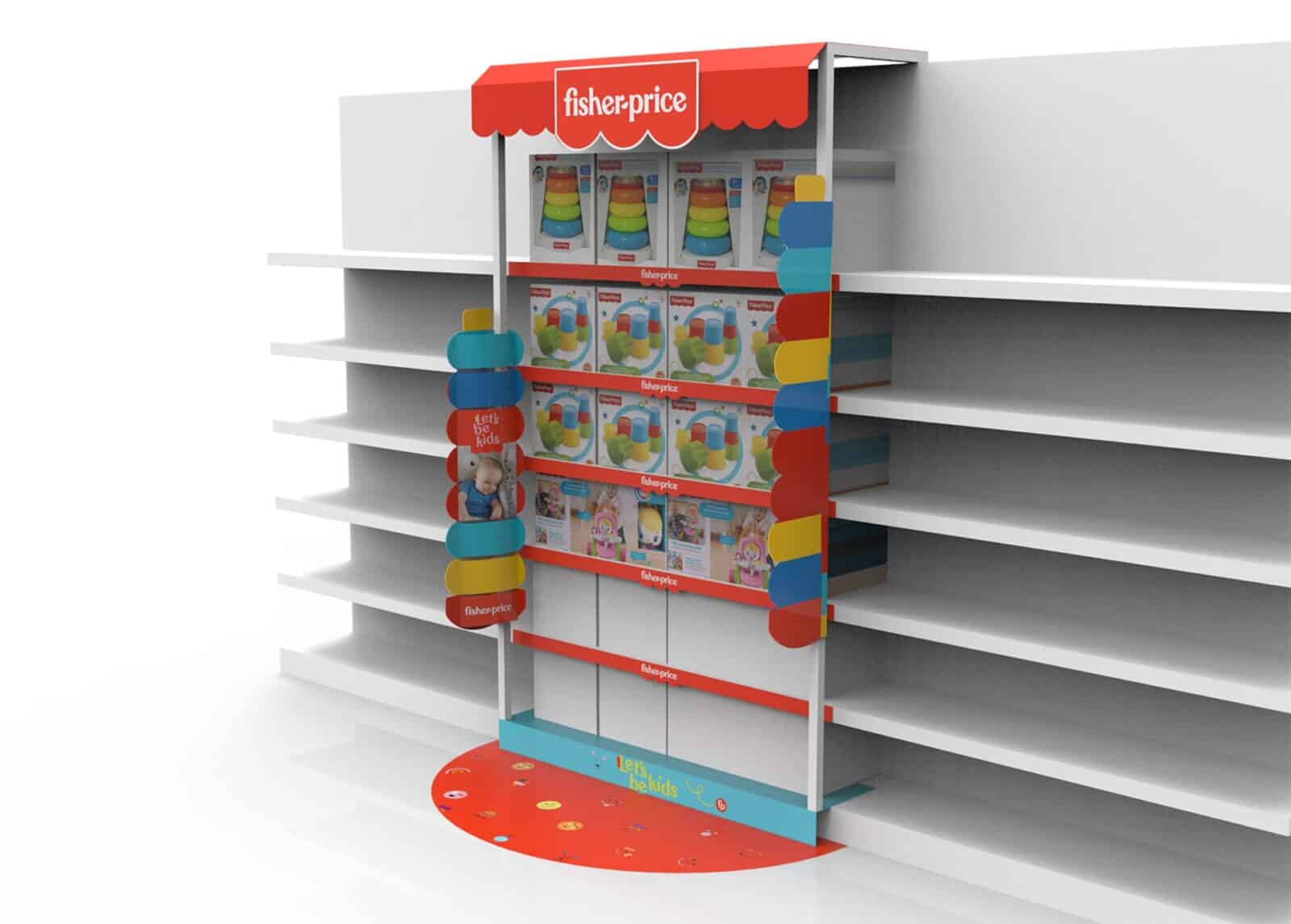 עיצוב קונספט ותכנון יחידות בינוי למותג פישר פרייס, התכנון "מתלבש" על מידוף קיים ונותן בולטות בשטח על פני המתחרים באמצעות חציצה, כובשי מדף, מסגרת פוקוס, הדר מיוחד ותלת מימדי ופוטרים. האלמנטים תוכננו בשילוב חומרים שונים.